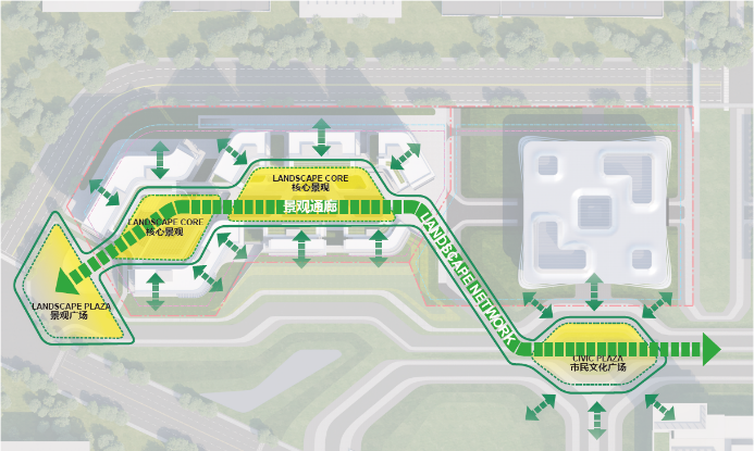 团队将网谷绿洲作为设计概念,借由自然的内生外向性,营造出开放的生态城市形象,以此暗喻共享中心科技,象征网安基地在守护国家网络净土的中坚地位。设计将片区规划中的休闲生态绿网作为纽带,通过景观广场、核心景观通廊以及空中绿色平台,构建立体多层次的生态系统,在穿插交错的空间中,以绿色有机缝合各功能业态,营造出休憩游玩的城市公园。