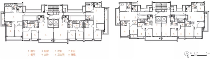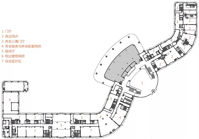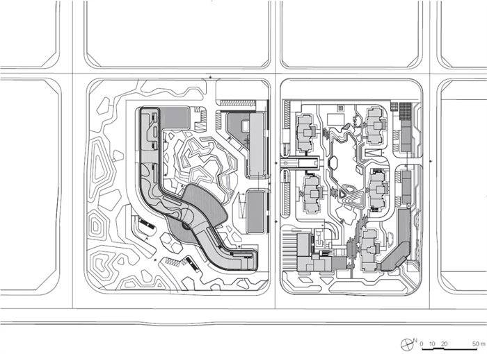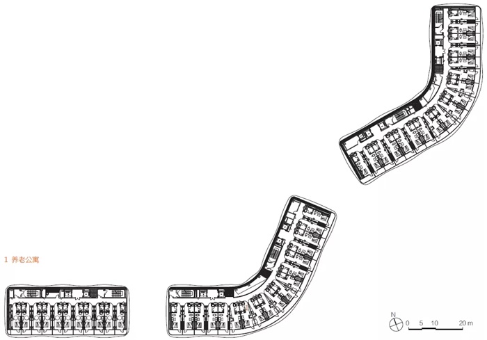 项目用地分为40-3、40-5两个地块:40-3地块设置自理型养老用房、护理型养老用房、综合医疗区域和养老服务配套体系等功能区,3幢高层养老用房的顶层、底层相连,实现配套体系的全面共享:40-5地块设置5幢高层住宅和1幢养老公寓,结合中心景观,布置90 ㎡、118 ㎡、128 ㎡户型,沿海一线布置143 ㎡户型。