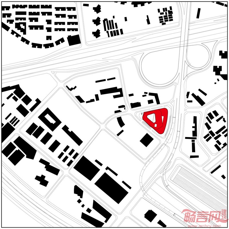 基地位于被三条高速公路包围的城市边缘,周边的建设环境依然处于规划过程当中,具有相当的不定性。为了不被这样嘈杂、混乱的环境淹没,建筑注定需要率先成为定义这个区域的标志物。毗邻的三条高速公路,决定了建筑形体应以一种完整和连续的姿态,与大尺度的城市基础设施之间形成对话。将建筑体量做整的同时,又必须考虑如何消解巨大的体量。一方面,在保证完整和连续表面的前提下,裂解出实体面之间精致的开阖关系,为地面行人创造近人尺度的视觉感受;另一方面,在基地一端退让出一块三角形区域,改善周边的城市公共环境,从这个视角,建筑在每个侧面的表情各不相同。