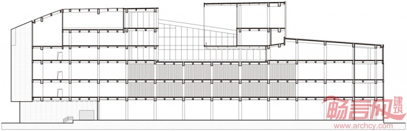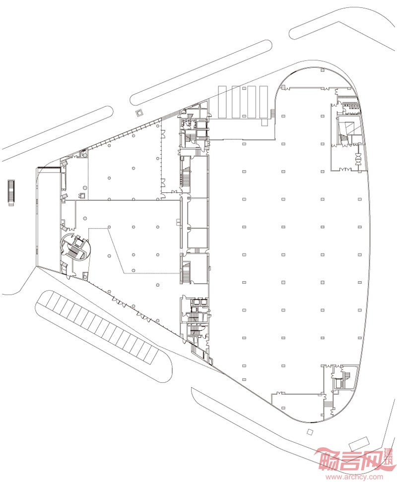 在建筑内部,盘旋环绕的建筑形体围合出一个由美术馆、印刷工厂、办公空间、底层公共空间等多个部门共享的空中花园。作为独立于外部不利因素的企业内部环境,在空间组织方面,将美术馆从公共属性的功能部分分离,与企业总部并列,独立地悬浮在景观资源最好的顶部,形成空间效果独特的独立艺术空间。这样的处理与流线的安排紧密相关,最终形成了能组织不同人群、不同参观方式的具有多选择可能性的内部丰富流线。