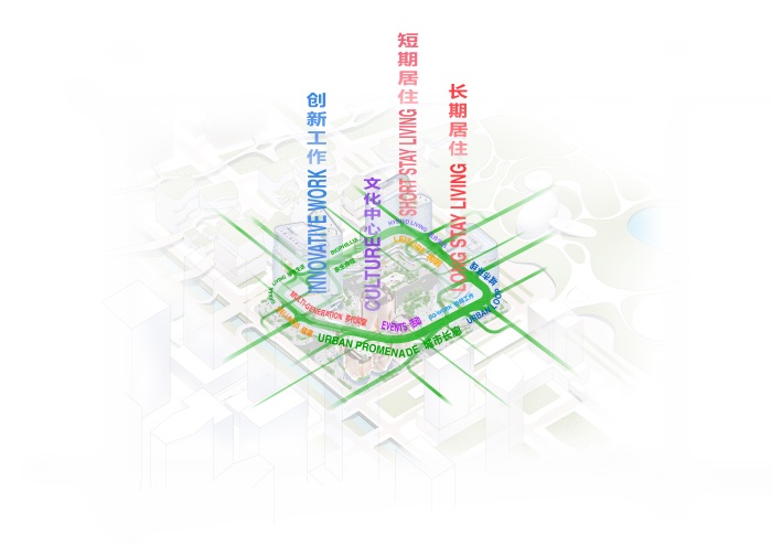 园区专为多代际社区居民的24小时使用而设计,每座塔楼承载不同功能——从灵活办公空间、小体量的灵动商业,到短期住宿的酒店客房及长期居住的服务式套房。一个文化场所作为园区的核心,而高架步道网络则作为社交纽带,实现塔楼及其功能之间的无缝连接。屋顶露台和户外聚会空间不仅可俯瞰城市全景与南海风光,也为人们提供休憩的时刻,进一步强化了人、自然与城市肌理之间的联结。