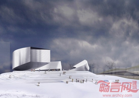 以“飘舞”为题的两个动态的形式围合成博物馆的户外空间,是节庆庆典时市民舞蹈狂欢的舞台,这一博物馆的灵魂空间通过台阶与南部广场相连,共同组成通辽最具蒙文化氛围和人气的城市公共空间。