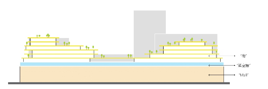 在多轮设计研究与沟通下,Aedas董事陈玉莹提出“山水·街市”的总体设计理念——如同于花都山水田园间的街市般,以“上碎下整”整体造型的设计策略、 “Mall+街”的空间形式减少对城市压迫感,创造高低区的多首层空间,以形成具有相对平缓、舒适及宜人场所的造型体量。