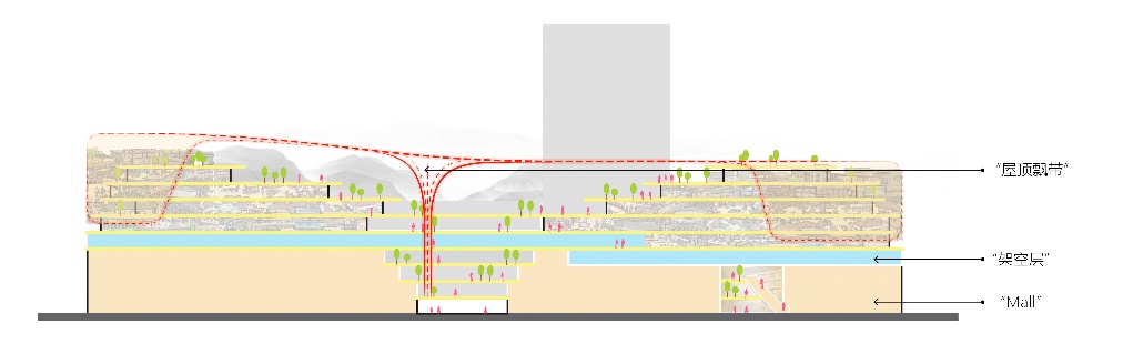 屋顶飘带之上是引入三星级酒店的100米塔楼。在裙房空间层级较丰富的情况下,设计采取以纯粹体量呼应设计整体。塔楼以简洁的形象与下方裙房丰富的体量相得益彰,共同形成地块和谐统一的建筑形象。