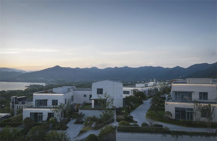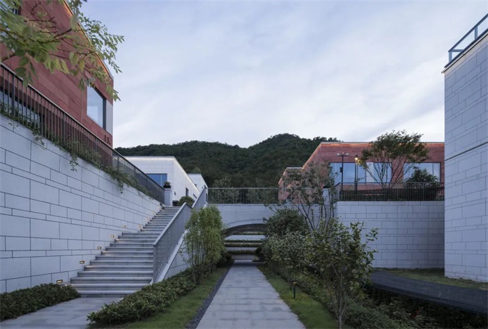 建筑主要材质为石材一体板,外立面石材的纹理和质感与此间自然环境的背景更为融洽。以组团为基础的色彩单元,配以精致的米白色和稳重的淡黄色穿插,同时以村为单位点缀粗粝的红色砂岩组团,增强可识别性。同时为山林中的小镇增添一抹亮色,让这个湖畔的山地聚落在望湖观山的同时,也成为风景本身。