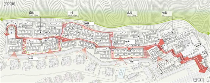 不同于城市片段中空间集约、人员密集的办公、商业环境,在自然资源如此丰厚的基地内,我们想创造一种接近于度假体验的商业与办公氛围,让项目所在的山水自然环境与人为雕琢的建筑空间充分渗透,满足使用者对所谓山地小镇的期待。为此我们利用一条蜿蜒起伏的“山线”将场地内部划分为四个不同的聚落,同时由一条平缓的“村线”将四个聚落串联起来。根据各聚落和城市的关系以及自身的功能定位,四个聚落形成了“一市三村”的规划结构。
