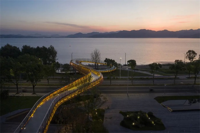 虽然有一路之隔,但建立小镇和湖岸的直接联系也是必不可少的动作,并成为观游体验的关键一环。“湖山一望醉霞迟,岸芷噙香待客时。”自茶亭市集而起,横跨环湖南路,曲折延伸至湖滨步道的连桥,被命名为“醉霞桥”。醉霞桥造型流畅、色彩明艳,桥面流动的曲线与湖面的微波荡漾相映成趣,临湖端盘旋而下的坡道仿若一座湖边雕塑,为湖边漫步的游客标记出此间水杉林、芦苇荡中最独特的记忆锚点。