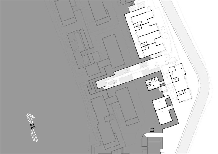 相对与城市道路接壤的茶亭市集,“村线”的水平标高距离城市道路已有24m的高差,先天的地形条件让小镇内的公共空间具有一定的私密性,便于小镇内部营造属于自己的空间氛围。以设计在“村线”两侧布置较为公共的商办空间,打造“村线”作为商业路线的空间界面, 14~18m的商业街宽度,既满足了消防要求又为两侧单元创造了一个舒适的庭院空间,提升了空间的丰富度和品质。而和“村线”稍有距离的建筑单元,则以花园办公的业态为主,更为私密又独享一片山水自然之境。