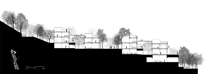 各个组团内建筑体量形成“U”字形围合关系,顺应地势,后排单元比前排高约4m,以确保每个单元都有湖景视野;后排单元的地下一层结合组团花园设有组团共享的公共服务空间,也为组团花园创造了活泼生动的空间氛围;层次丰富的组团建筑形态形成了多层级的露台关系,和山地地形带来的台地形态相呼应,同时相邻组团之间也在不同层面将庭院打通,起承转合,层层递进,空间具有极强的进深感。建筑在这里成为场地的一部分,一同融入这山水之间。
