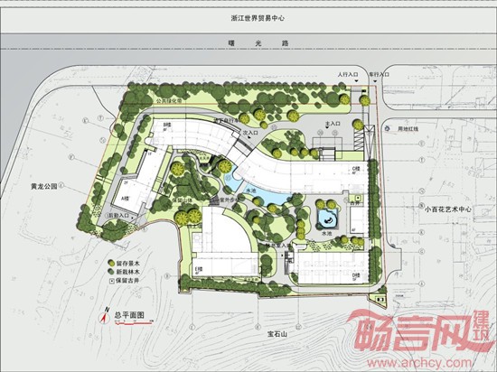 设计理念:浙江老年大学选址于杭州曙光路原浙江省艺术学校用地西半部,南依宝石山,西接黄龙洞公园。项目用地近似方形,内有原艺校校舍及较多经年景观林木留存,并有山体余脉包含于内。