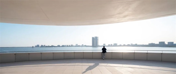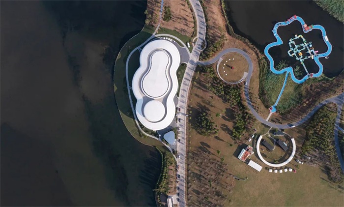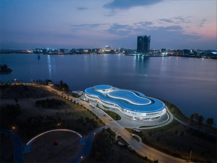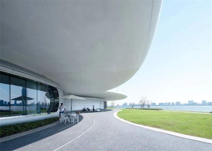 本项目设计引出了“湖中云,云中城”的概念,意旨让市民在漂浮、轻盈、通透的云朵中,去自由探寻未来的城市容貌。以云为设计灵感,我们通过对云的简化精炼提取出母题,作为建筑的概念曲线,打造出飘渺、流动的室内外空间,形成独特的建筑意象。流畅的建筑形体加深了和环境的结合度,温柔简约的流线造型展现出更宽广的包容性。
