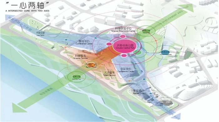 国际会议中心与展览中心作为科学城的核心门户,面向湘江呈现拥抱姿态,建立湘江与科学城中轴的连接关系。
