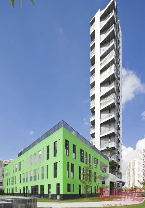 住宅及幼儿园加强外部空间的个性化设计,切实提升小区居住环境的品质。设计中对模数的运用贯穿于始终,住宅立面的铝制花架为住宅提供了遮阳以及私密、安全防护系统;同时,群体建筑的相同造型元素,如错动的露台、相同色彩语言逻辑如住宅:外白内黑、幼儿园:外绿内白的运用,为整个小区提供了和谐的、富于人情的、简约纯净的立面风格,使小区成为城市的新地标。