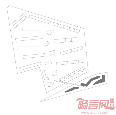 本项目位于一个大社区中的最后一块用地,场地为三角形,场地自然地面呈不规则高差,道路纵坡最小0.2%,最大7%,较难处理,设计师结合场地的三边形形式及一二三期板楼综合设计,注意尊重和利用原有地形地貌,充分利用东西向面宽大,南北向进深小的场地特点,将建筑设计为一栋分为A、B两座的高层板楼,有如北极之光,闪电式形态布置,使围合空间有收有放。