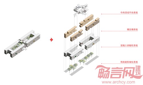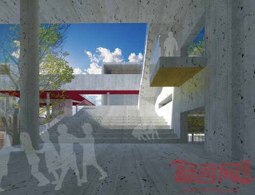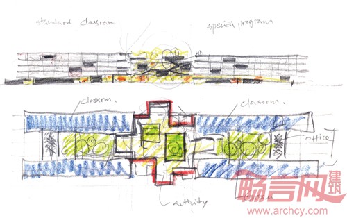 在满足日常的教学需求空间的基础上,建立公共活动空间系统,并希望由此激发更丰富的校园生活,鼓励校园中的交流和发现。我们在标准教室楼和专用教室楼之间,设置一个空间连接系统(水平/垂直),改善两楼之间单一的使用流线关系,创造代有选择性的多向联络。同时,提供丰富的户外公共空间,激发公共行为的产生。此系统象是能量集结的容器,同时又将其疏散到教学楼的空间和院落当中。空间中充满阳光,树木,和各学生的活动。