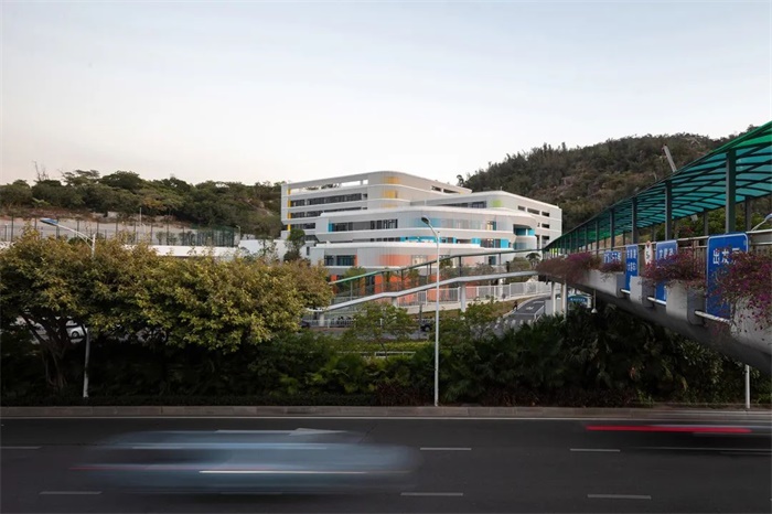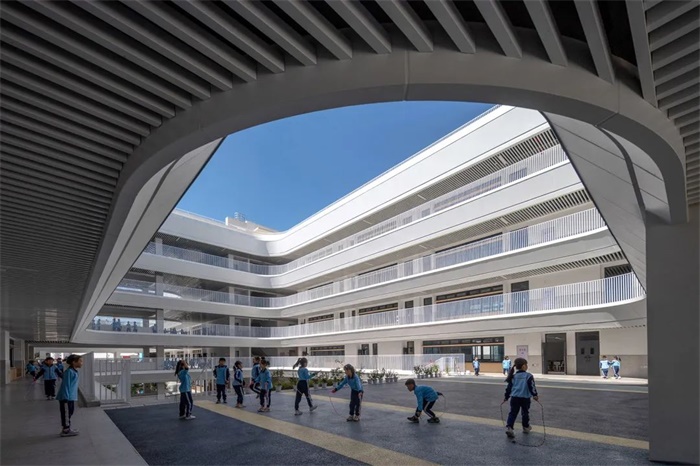选择了作为山与城的友好衔接的设计策略,学校建筑成了山体伸向城市的阳台。建筑在多个台地上架起、连接,整体校园形成一个具有充分可达性的观景平台群,在坡向城市的山脉西侧,不同标高的屋顶平台,适合远眺,也适合对望。运动场是最大的平台,其承接山脉、俯瞰街景,宽阔的视野与充足的阳光吸引孩子们来这里活动,既可沉浸绿色,又可观察城市。