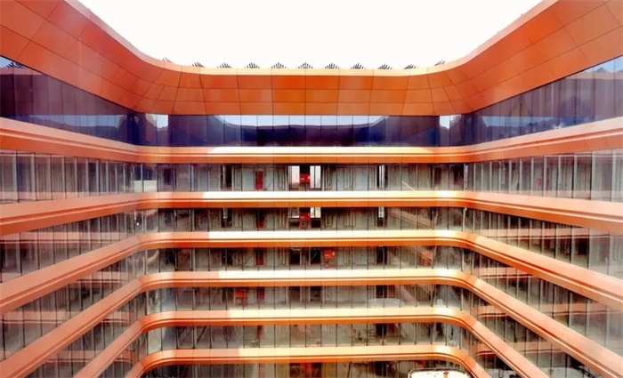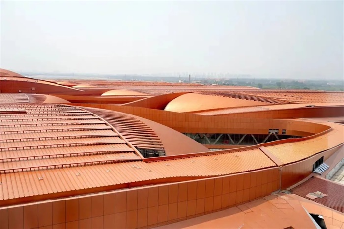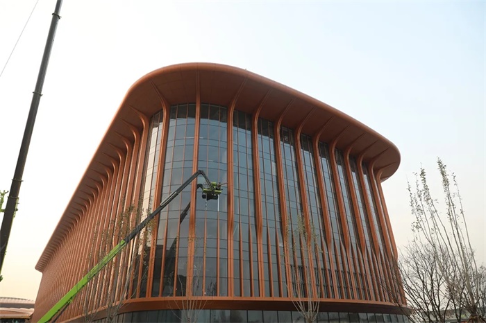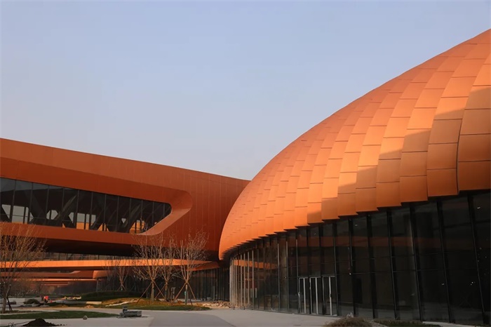 项目由北京建院(联合体牵头方)+扎哈·哈迪德建筑事务所设计。建筑的构造呼应了展馆、会议中心和酒店之间的一体关系,由一系列相连的线条和几何图形精心构筑而成,其灵感来自于中国传统建筑中琉璃瓦屋顶的纹理。同时,古铜色的色彩基调和外皮的巨型凹槽开窗更是给展览中心的二期空间增添了动感与活力。