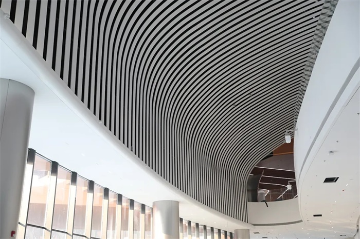 展览中心以‘紫金交织,光辉纵横’为设计理念,利用纵向线性的延伸,横向线性的重复,形成强烈的延伸感与秩序感。