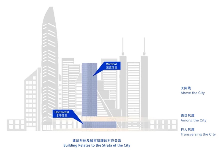 横向体量(商业裙楼)在视觉上与竖向体量(办公塔楼)互为呼应又相互平衡,在设计上力求彰显海能达“向高度和广度不断进取”的企业文化及品牌形象,以现代手法诠释简洁,体现大气与明朗的几何线条和建筑美感。