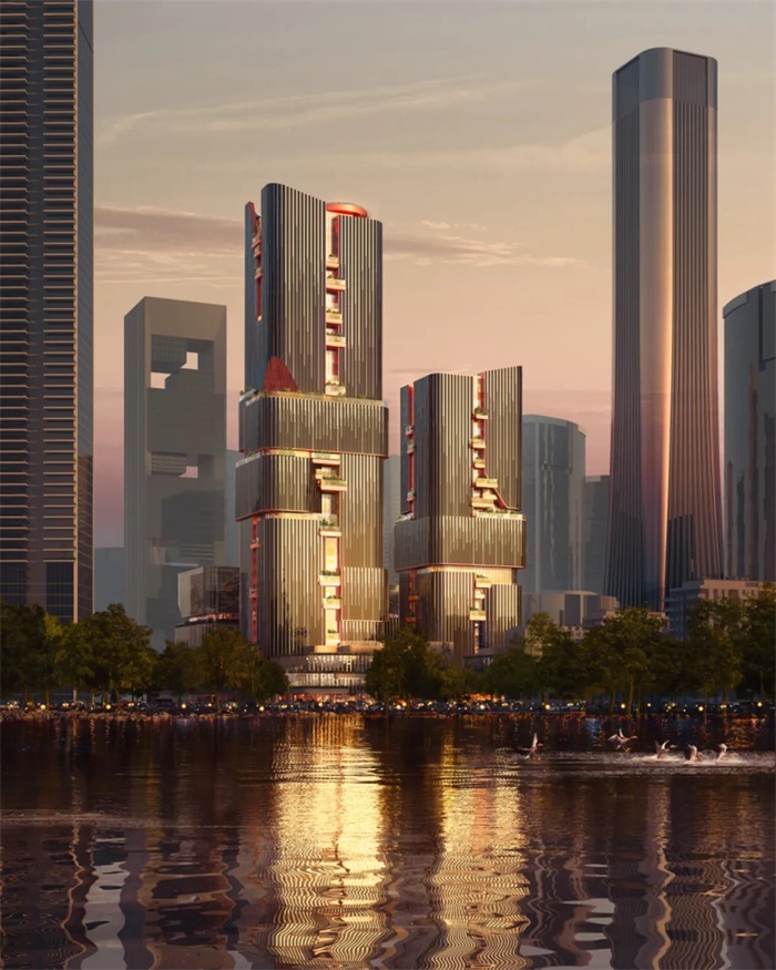 设计包括两座塔楼和与之毗邻的城脊,总面积达约十八万七千五百平方米,涵盖办公、酒店、商业和文化空间。城脊顶部是文化场所“京东中心”,内设有剧场和展览空间,向公众开放。塔楼下方为共享裙楼——“京东世界” ,这里将成为举行各种文化活动的场所。凭借其综合功能和策略性的空间布局,“画境之城”旨在与周围环境和谐共生,并通过其对城市文脉的融入激发城市的活力。