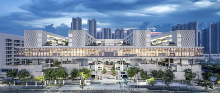 市宝安中学(集团)第二实验学校位于松岗车辆段,场地内存在 10 米高差。一半用地位于地铁车辆段站房屋顶,仅能布置场地而不能用于建设,另一半用地需满足各个方向后退 12 米的要求,导致最终可建设用地仅 1.28 万平米,需在此范围内建设 6.8 万平米的学校功能。
