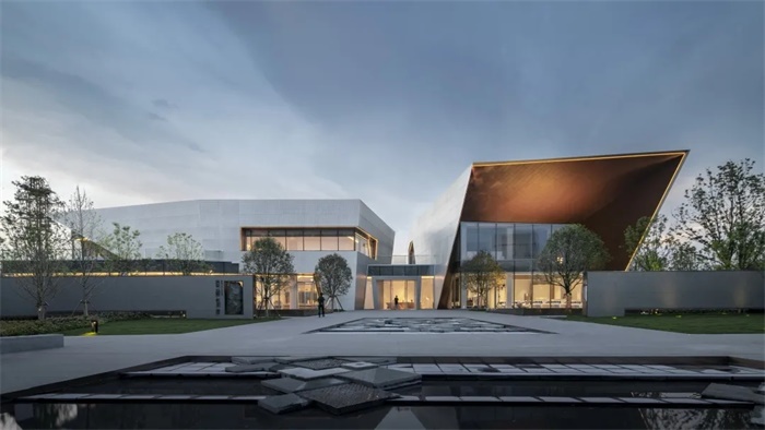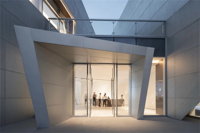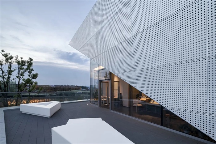 通过对体块的切割,形成前卫现代的建筑形体。大面积穿孔铝板、仿木纹铝板和玻璃体块的结合,使得整体形象极富张力和工业美感。