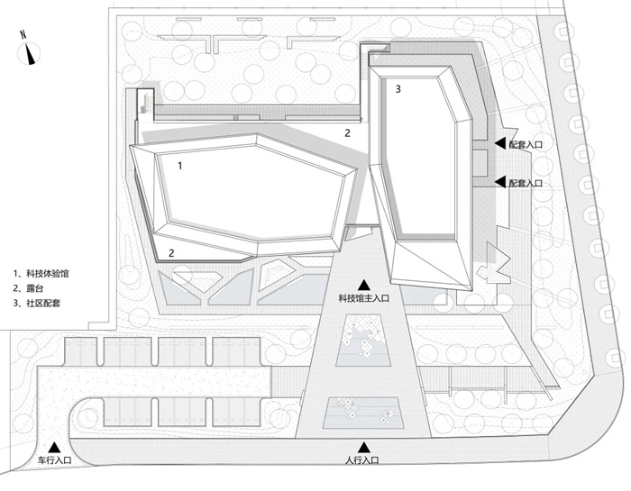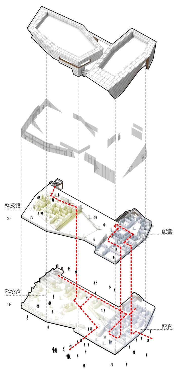 建筑两部分的转角开口,形成了一个梯形的入口广场。由此进入经过门厅,来访者可以顺着几何空间不断向上,参访两层的各个主题展厅。展厅的主题则主要关注于科学和技术相关的内容,并设置了可供年轻游客参与的互动装置,寓教于乐。