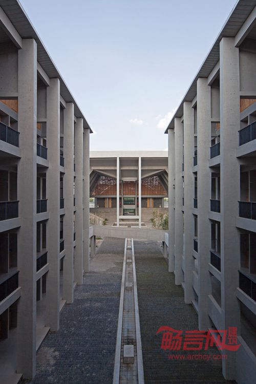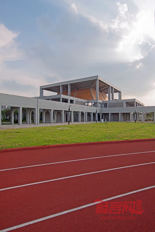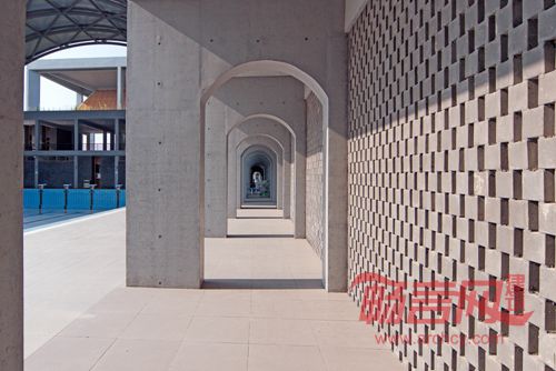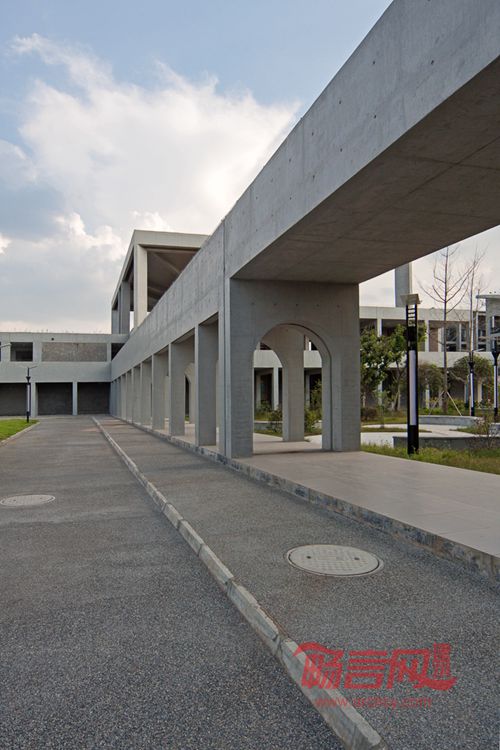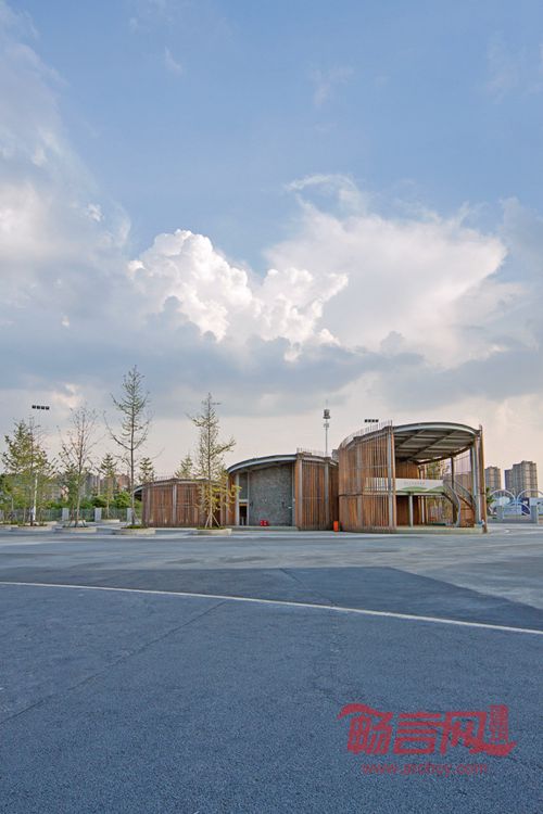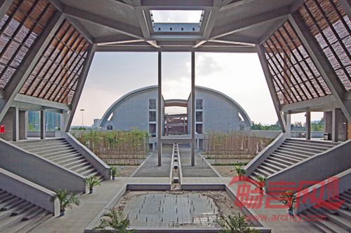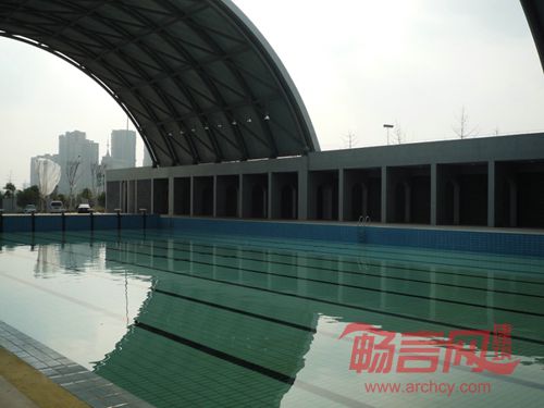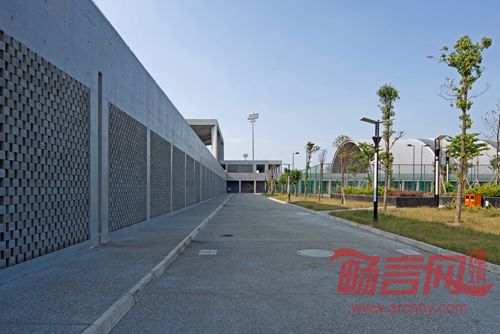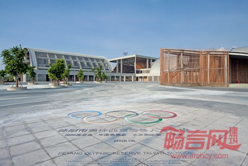 建筑结合德阳气候,尽量采用半开放、自然通风采光的空间,以利节能。建筑材料大量采用结构性清水混凝土。钢拱屋面和本地灰砖、竹材,表达健康、生态的理念。强化建构逻辑,从某种意义上体现了奥林匹克精神。