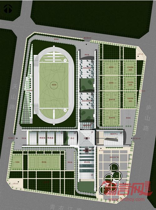 该项目设计的思路就是将传统的体校设计转换成开放式的城市体育公园。十字形建筑平面把室外运动场地分为田径、篮/排球和网球3个区,十字平面内将校舍、球馆、泳池、网球场延4个方向展开。中心是更衣沐浴和管理用房,相互之间以休息长廊连接。
