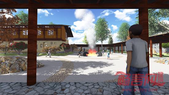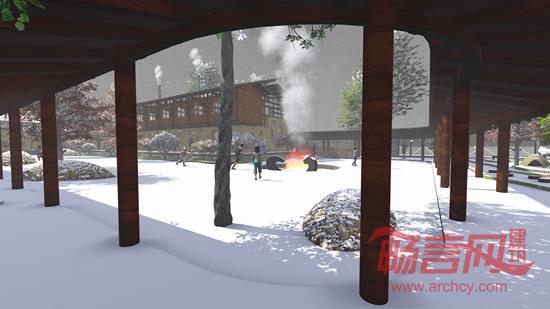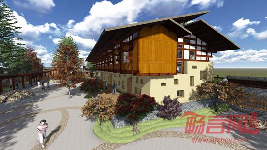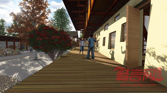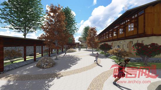 建筑群落由三部分组成:接待办公,后勤服务,教室和教师宿舍。建筑以及连廊,将用地分为内外两个不同的部分,并通过穿插路径加强两部分的联系,外侧以绿地为主,设置微地形,在不同的高差上设置游戏设施,内侧由连廊划分为两个大小不同的庭院,主庭院铺设沙土,设置沙石堆,供小朋友们游戏,锅庄布置在西南庭院较为开阔的地方,作为群体活动的场地。小庭院作为服务用房的小院落,起到分割空间的作用。