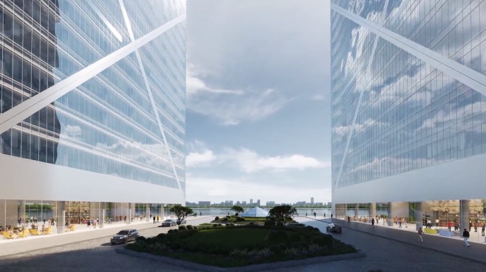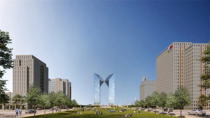 同时,由于整个项目位于从上海市区和浦东机场到滴水湖区域的林荫大道的尽端,为延伸这条重要的视觉轴线,建筑整体造型设计为两栋造型协调优美的塔楼,平面上呈60度角的平行四边形,在塔楼顶部各有一个旋转错位的四角锥体,两者的端点轻巧相连。精巧的连接形成一个拱门形状,将观者的视线引向整组建筑的中心位置。