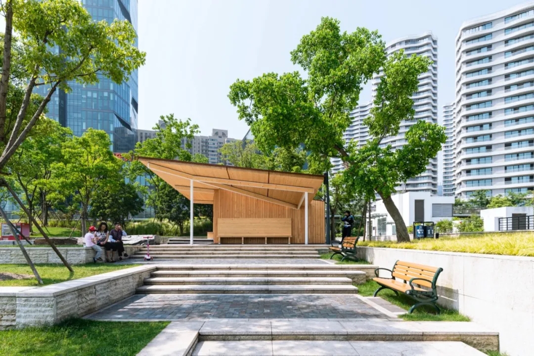 设计团队通过结构加固后改造利用单跨混凝土双层框架结构的自行车库。全部保留场地内有 12 株经年高大乔木,并能留给将来的楔形绿带。