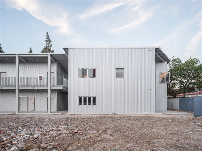 办公楼与服务楼采用银灰原色波纹镀铝锌钢板的轻钢单坡屋顶。新建部分的外墙也全部用原色波纹镀铝锌钢板包裹。宿舍楼的围护墙体采用页岩砖砌筑,底层外廊西立面加了镂空花格砖墙。