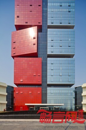 在项目伊始,大厦的设计目标就被确定为“反映物流的运作建筑”。塔楼被分为一系列上下叠加和左右排列的玻璃盒体,这些玻璃盒体带有“集装箱”的隐喻,从柔和的晨光到辉煌的日落,幕墙的反射玻璃将不断对大气和气候的条件作出回应,在一天中呈现出丰富多变的面貌。每一个玻璃盒体都具有四层的高度,玻璃盒体间通过一层高的凹入进行分隔。位于西南角的红色玻璃盒体成为沿现代大道东西向行进时最为瞩目的视觉特征,其中一个扭转的盒体暗示了入口的方向。同时,玻璃盒体的铝合金底边及天花趣味性地以旋转交替的方式点缀以蓝色和红色这两种不同的色彩,增强了建筑的导向性和挺拔感。