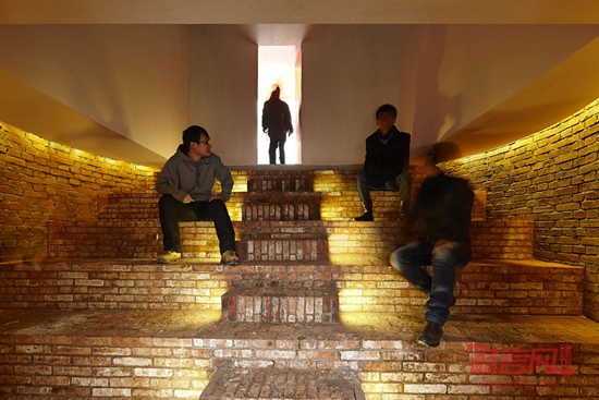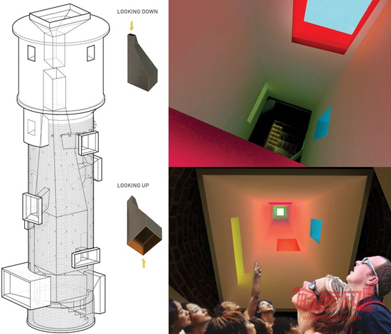 改造是在对待历史与现实的审慎态度下展开的,并探索如何将新的现实植入历史样本中:一方面,我们尽量不去碰触完整保存的水塔本身,只进行必要的结构加固和局部处理了塔身上原有的窗洞口;另一方面,新加入的部分-一个复杂精巧的装置-被植入到水塔内部,中间的主体是两个头尾倒置的漏斗,较小的位于水塔顶部收集天光,较大的在塔身内部形成了一个拉长的纵深空间,并连接着多个类似“相机镜头”的采光窗-这些将环境光线经过间接反射导入水塔内部的采光窗从塔身上每一个可能的开口“生长”出来。水塔的底部,连接入口与抬高的观景平台之间用回收的红砖砌成可坐的台阶,这里将成为一个“小剧场”,为周边的公众提供一个小型活动或集会放映的场所;从这里向上看, 水塔成为一个间接的感受外部世界的感觉器官,光线从顶部的光漏斗及每一个不同形状及颜色的窗洞口进入到水塔中心的隧道内,并在一天之中持续着微妙的变化。而从悬挑出塔身的观景平台向周边望出去,这一装置则成为一个单纯的观察外部世界的取景器。