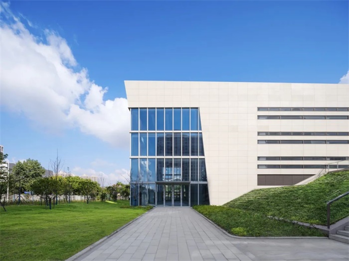 基地不规则,建筑却太“规矩”,反而不协调,因此建筑师根据基地形状和建筑功能需求,在建筑形态中运用矩形与圆形的搭配,将西侧体育中心设计为相对硬朗的、完整的立方体造型,东侧文化中心则采用柔和的、类椭圆的造型,呈现出一刚一柔的设计风格。