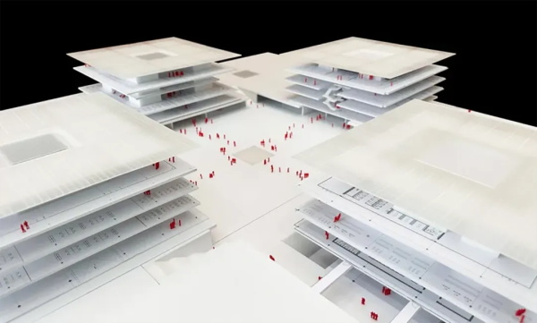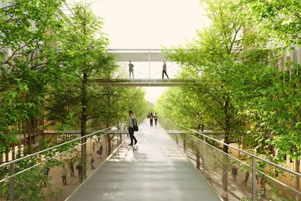 校园分为两个地块。教学科研区包含十栋实验室与办公建筑,中央设置“学术共享空间”作为组织枢纽。文化与公共功能沿城市界面布置,礼堂、体育中心与图书馆向公众开放。居住生活区包含23栋建筑,融入自然景观之中。建筑设计高度控制在20米以内,低于森林冠层,强调通透与开放。通过架空与退让首层空间,减少建筑对地面的占用,使体量仿佛漂浮于林间。每栋建筑均设置光伏屋顶,集中能源中心则提升整体运行效率。