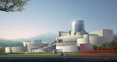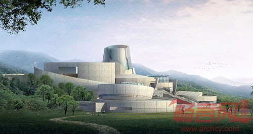龙泉青瓷博物馆位于龙泉市主城区以南的 城市入口处。基地地貌由两个平缓的山脊以及中间的洼地构成。背面山体给建筑提供了优美的环境背景。由于历史上青瓷生产高度发达,目前在龙泉四周的田野上随处可发掘到过去留下的窑址和青瓷碎片。处在这一特定的环境里,建筑以“瓷韵——在田野上流动”为创意,以一种非建筑的手法来表达这一博物馆的形象,如同考古发掘中层层叠叠的青瓷器物破土而出,自然地放置在田野之中。建筑造型是青瓷这一珍贵的文化遗产的抽象表达。换一个角度去欣赏,它又像绘画艺术家笔下的一组景物,展现出了一幅恬静、优美的画面。
