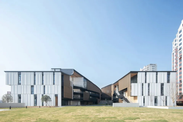 建筑的造型语言借鉴转译了坡屋顶、白墙、木格栅等传统元素,但以实验性的尺度和材料细节营造出全新的场所特征。在这样一个郊区新镇中,这个建筑稍显奇异,但却也是熟悉且亲切的。