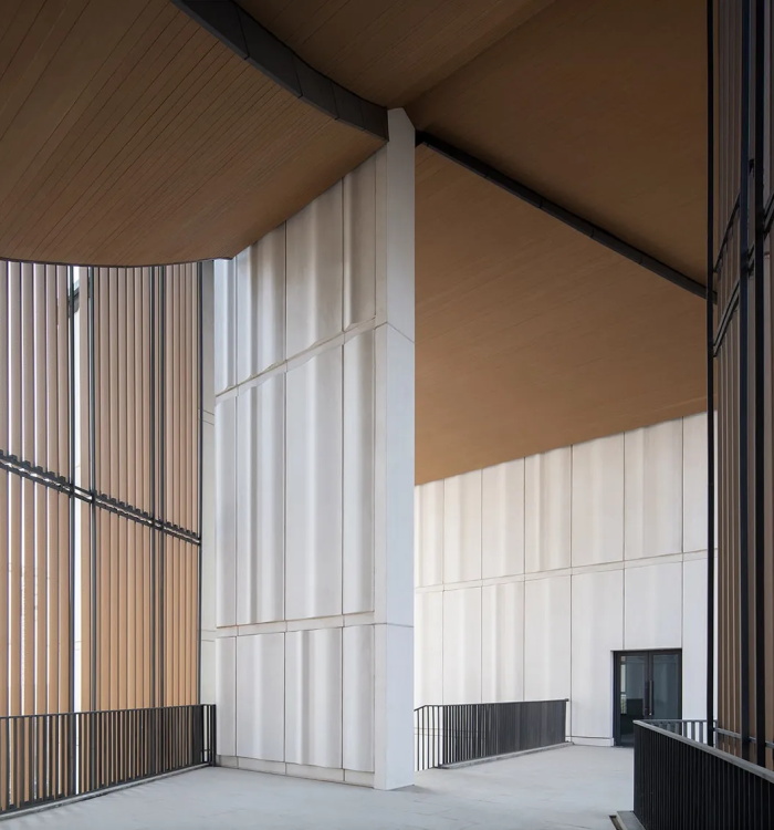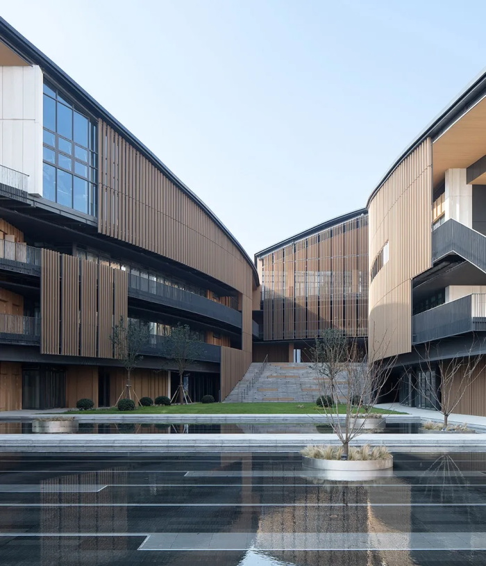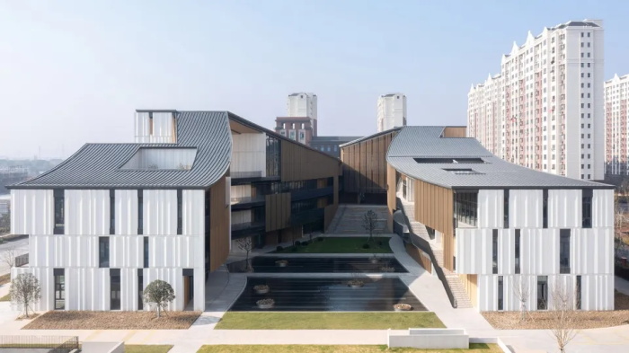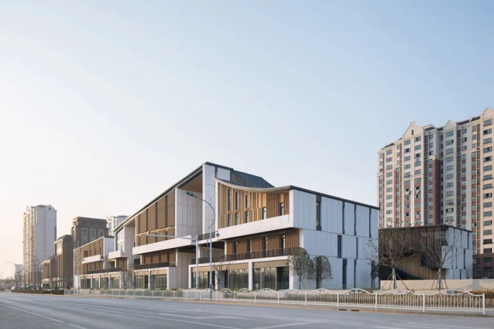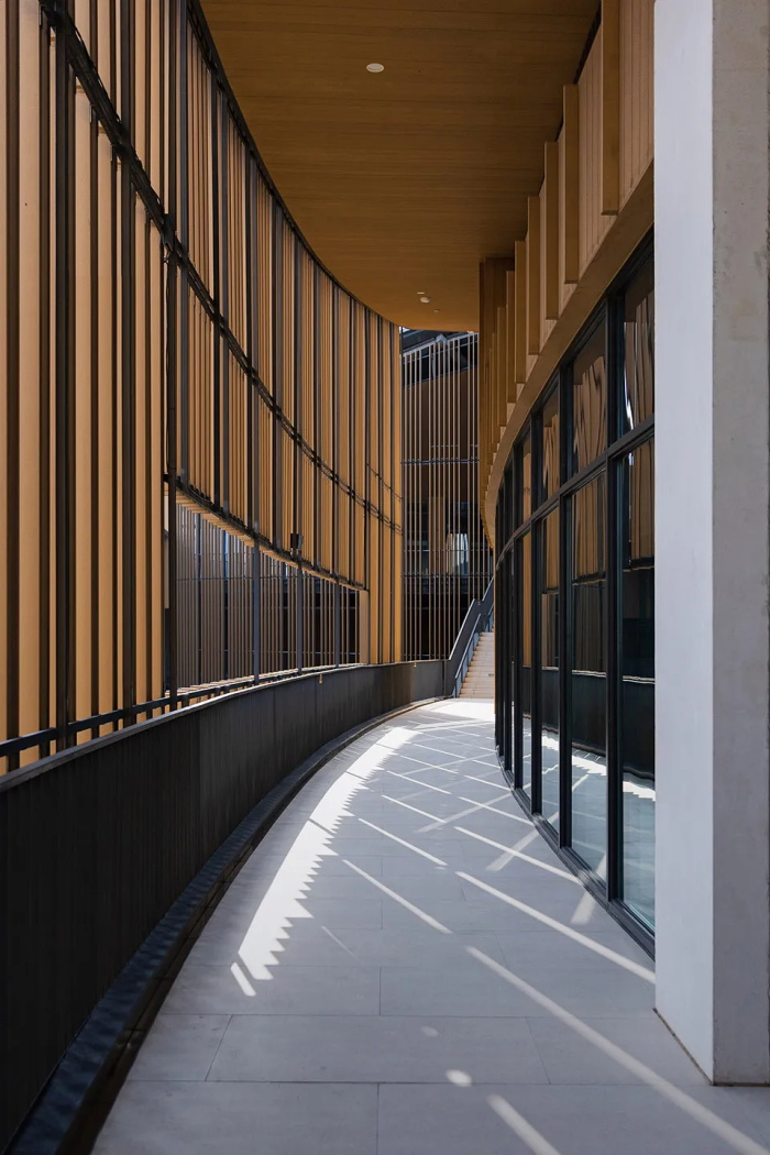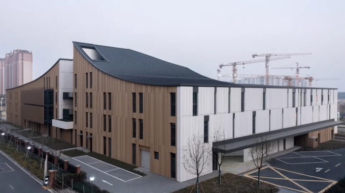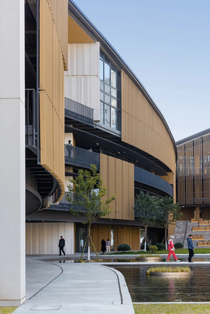 项目位于上海市奉贤区柘林新镇。同样由集合设计完成的新镇城市设计提出了南北向主街指状公共空间向地块内延伸的空间策略,建筑的空间布局遵循了这一导则建议。建筑通过若干体块切割操作与城市空间相对话。南侧沿街立面呈现为一组小型建筑物,相对低调。最具戏剧化的弧面格栅则面向了场地内部向东开敞的中央水景庭院,形成城市界面上的亮点。