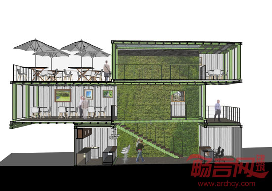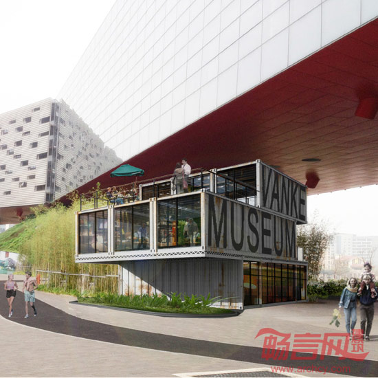 设计在造价可允许的范围内利用集装箱构筑一个临时性的入口作为昭示,利用集装箱特有的快速搭建以及能够回收的特点,结合室内垂直绿化技术的展示,表达出万科对于可持续发展的思考,对环境的关怀,同时新搭建的这个博物馆入口兼具咖啡吧和公共卫生间的功能,为万科架空底层的公共花园提供一个服务配套的场所,一举多得。