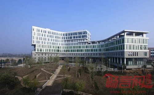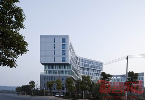 建筑形式与地段位置、红线和功能相呼应。两个人字体量相嵌,一高一低,分别作为人福科技的办公和中试部分。建筑体量分层通过退后、出挑以及不同材料的使用,通过流动线条体现科技感,并与广场和高新大道形成有趣的对话。平面和立面分隔都使用了750mm的模数,适用于家具、石材和铝板分隔。