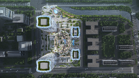 设计构建出多层次的公共空间与绿化环境,将充满活力的综合体打造成为多孔通透的城市枢纽,以适应城市的快速发展。流畅的建筑造型自然延伸至充满绿意的裙楼,形成自然友好的公共空间,促进交流,激活活力。