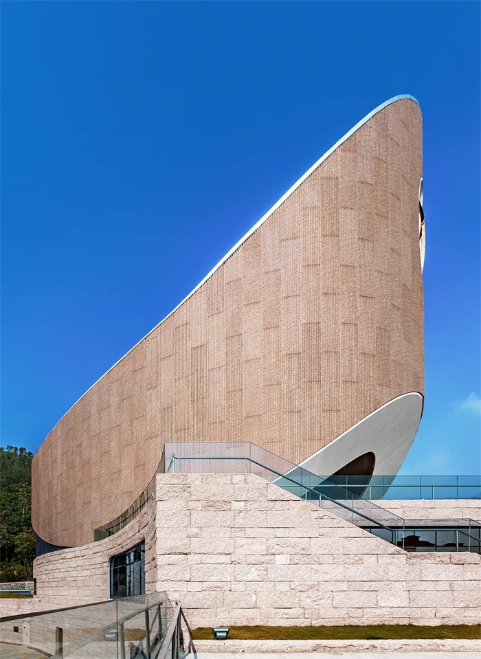 在被这一意象所打动的同时,我们也意识到项目的局限性,因此我们的方案由两种元素组成:建筑下部以花岗岩板包裹,看起来像阶梯状的岩石地基,矩形结构可以灵活调整空间分割,满足各种世俗使用需求;而顶部是教堂的中殿,唤起人们对抽象方舟的想象,以具有纹理的GRC面板装饰。这样既避免了从字面上转译意象,又能微妙地表现故事情节。