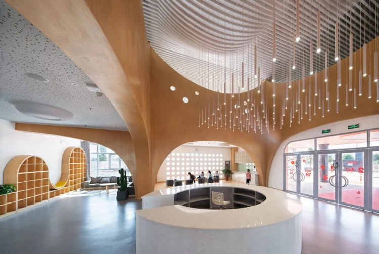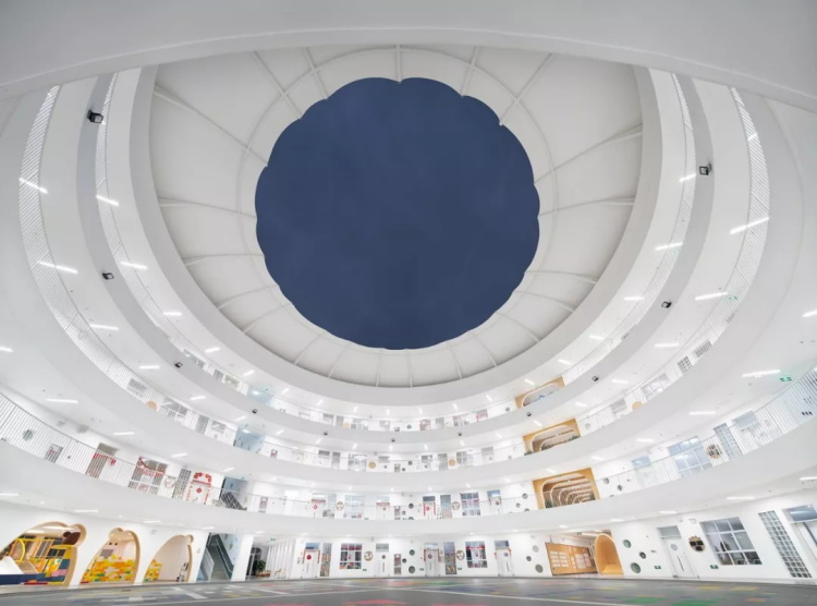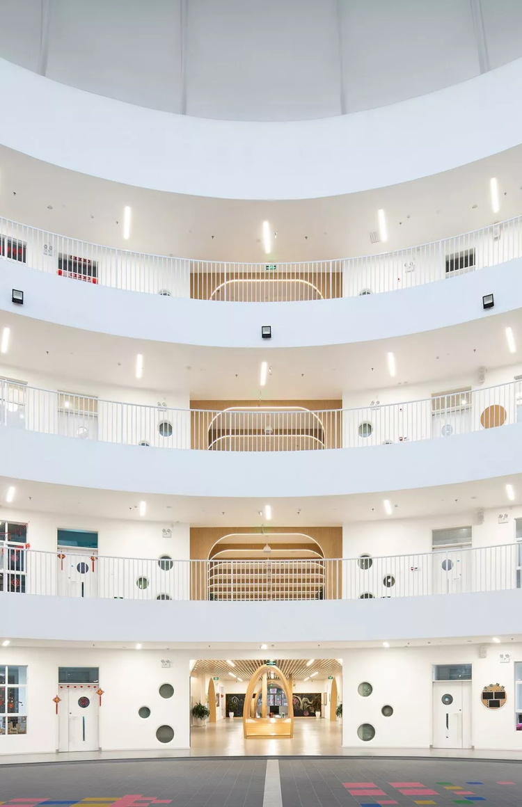 地面利用色彩来突出空间的活跃氛围,它更像是一个圆形的小操场,孩子们在这里能够自由自在地奔跑玩耍。