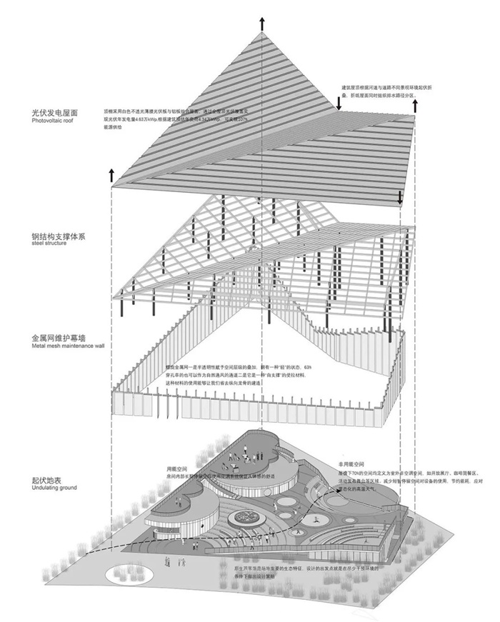 为了实现“纸飞机”造型营造出的轻盈观感,建筑整体建构逻辑遵循了“轻量化,少用材,多裸露”的设计原则。主体结构形式采用全钢结构框架,通过与结构工程师经过多轮柱跨比选,最终将11米高钢柱柱径控制在了350mm,实现近30:1的高细比,最小化飞机造型与地面的粘连感,也节约了近60吨用钢量。屋面构造根据光伏板出厂模数尺寸,结合排水沟统一划分,最小化订制尺寸与现场加工。屋面底部设计初始设计方案为全裸露钢格构,但在施工过程中由于钢构误差过大,导致局部节点的观感不佳,最终采用的折纸造型铝板嵌入钢构框架方案,也作为“折纸飞机”造型在室内端的延续。外围护镂空金属挂网也刻意与屋面、地面脱开,通过工字钢螺栓杆的节点设计,强化了飞机悬浮感受,也呈现了伸缩型构造的基本逻辑。