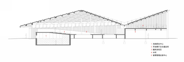 建筑所处环境北面临河,南侧面向园区入口广场,因此在高度处理上设计将南侧适当压低,以在广场方向呈现低调谦逊姿态,吸引游客进入;北面面向河道方向景观开阔,又恰好正对天文馆,需要一定高度的空间尺度将景色底景纳入建筑。与此同时,近千平方米的建筑屋面排水压力无可避免,如能结合坡屋顶造型直接自然排入河道,则可节省排水管道设施与立面的竖向构件。综合上述不同方位的高度需求与排水需求,一个“三面两折”的折纸飞机造型自然形成。通过三个完全相同的直角三角形屋面镜像叠合,巧妙的解决了不同朝向的抑扬转承,纸飞机造型整体向河道进行10度倾斜,兼顾自然排水,光伏受光与飞机“起航”之势三重目标。