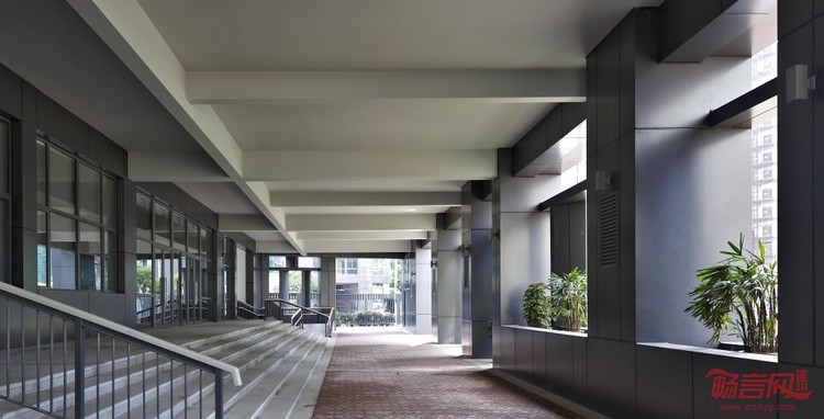 外部的紧密性包围与内部的潜在性突破形成一种张力结构,建筑寻求的是在维持系统张力平衡的前提下,将众多信息与元素打破重组,最终达到重组性平衡。向外谋求以严整性与逻辑性为诉求的防御性定位,通过建筑语汇的巧妙运用,将城市肌理中交织的纵横经纬延伸到建筑形态之上。两个三维的L形体量紧密咬合,强调形态构成的逻辑性和紧密关联性。向内寻找以流动性与协调性为诉求的定位,将公共活动区屋顶内院空间与运动区域联动融合,形成一组连续流动的灵动空间,在集约用地的前提下最大限度地提高公共空间的使用效率与景观价值。