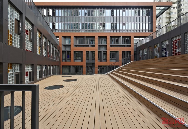 一般情况下,教育建筑由于其低容积率、低密度要求,必然形成在城市密集城区背景下的“空间洼地”。黄浦区第一中心小学就具有这种典型的区位特征。设计着眼于使“空间洼地”凭借其文化特质与性格特征得以突破而非仅凭体量或高度争夺话语权。红灰两组纯净的L型功能性体量彼此交叠穿插,在极其有限的基地内完成了独立完整的内向型围合空间的塑造。它最大限度地屏蔽了外界不利因素的侵扰。“城中城”的原则保证了教学功能的有效实现。