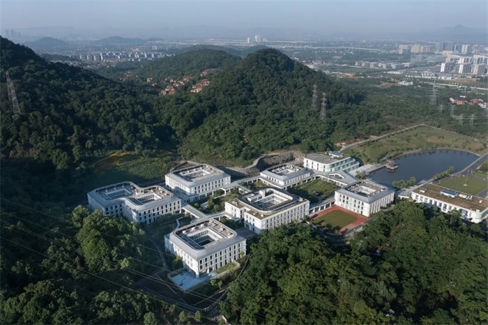 项目位于杭州余杭区瓶窑镇大观山果园,周遭山形环抱,西侧为一浅水塘,青山修林,水渚回环,勾勒其特有之山形水势。依据地势走向,设计最大限度尊重场地现状,分为层层台地,解决高差问题,节制土方挖运,独特的地形促成了特有的建筑关系和景观环境。场地西侧紧邻外部道路,布置行政办公区,东侧私密性较佳,作为生活区使用,中部则以公共服务沟通着个体与环境,整体布局动静分区,便于管理。在景观设计中,保留山头雨水汇集向西流的路径,巧妙地将其打造成“曲水流觞”的内部景观。以水为线索,串联起各个组团绵延的溪涧顺势而下,曲折尽致,汇入湖中。